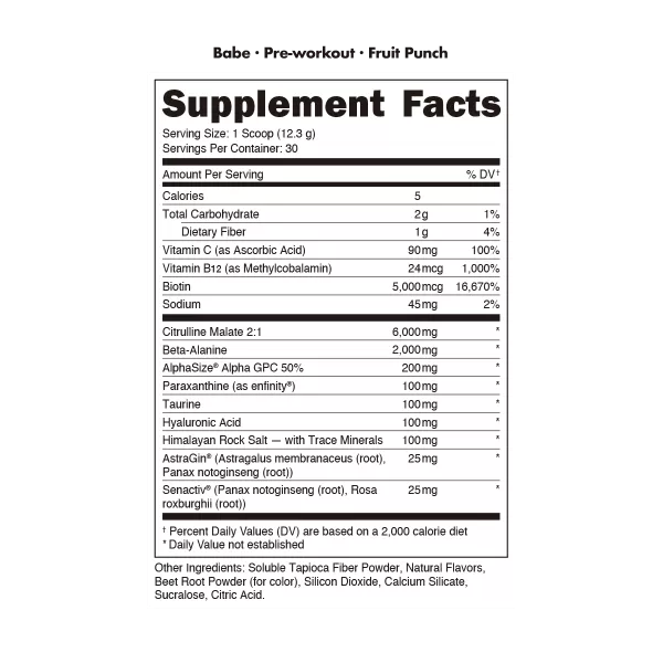 All that youd expect from a Bucked Up Pre-workout, like sufficient doses of beta-alanine for strength, recovery, and endurance. Babe Pre-workout doesn't stop there it's also packed with hyaluronic acid and biotin to give you that glow you dream of.